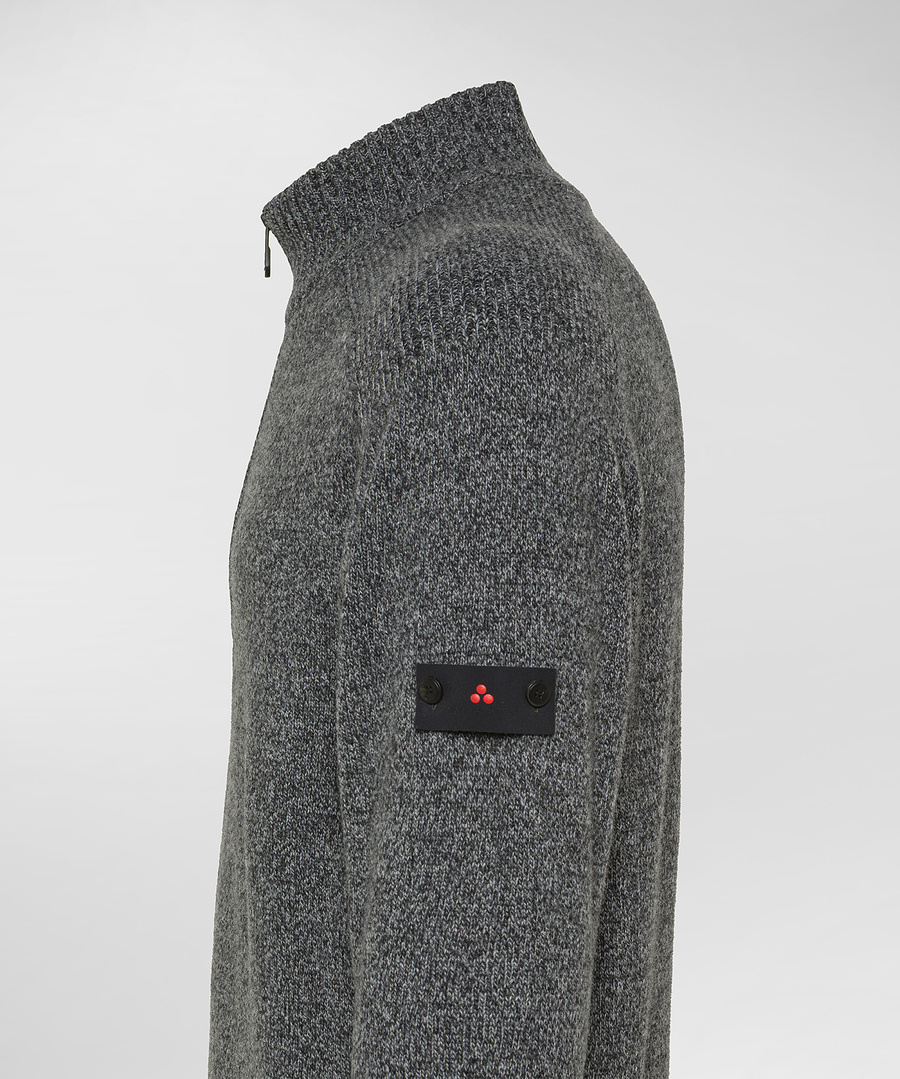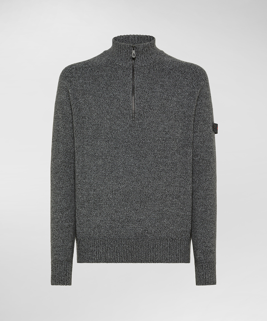 Zachte, warme trui met hoge hals, halve ritssluiting, lange mouwen, breisel van moulinéwolmix. De hals, manchetten en zoom zijn afgewerkt met bredere ribboorden dan de rest van de trui. Afneembare logostrip op de arm. Een strakke look die grootstedelijke sportkleding interpreteert met een jonge en dynamische uitstraling.