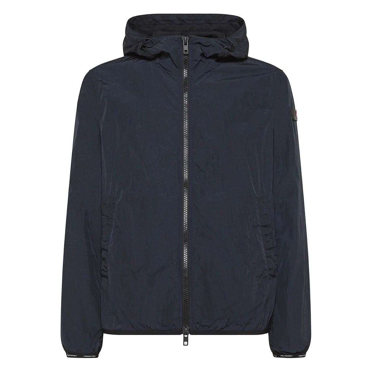 De Peuterey Nigle is een lichtgewicht nylon canvas bomberjack met een kreukeffect door het afwerkingsproces. Het jack heeft een volledige, zwarte ritssluiting, zijzakken, een vaste capuchon met trekkoord en een waterafstotende coating. De coating zorgt voor thermische isolatie en vochtbestendigheid.