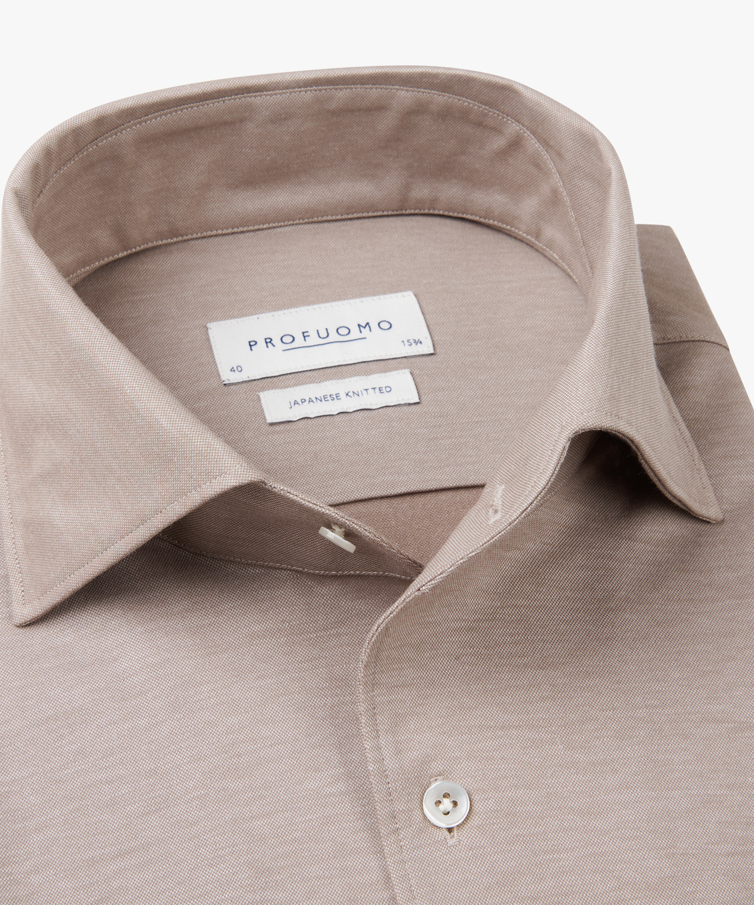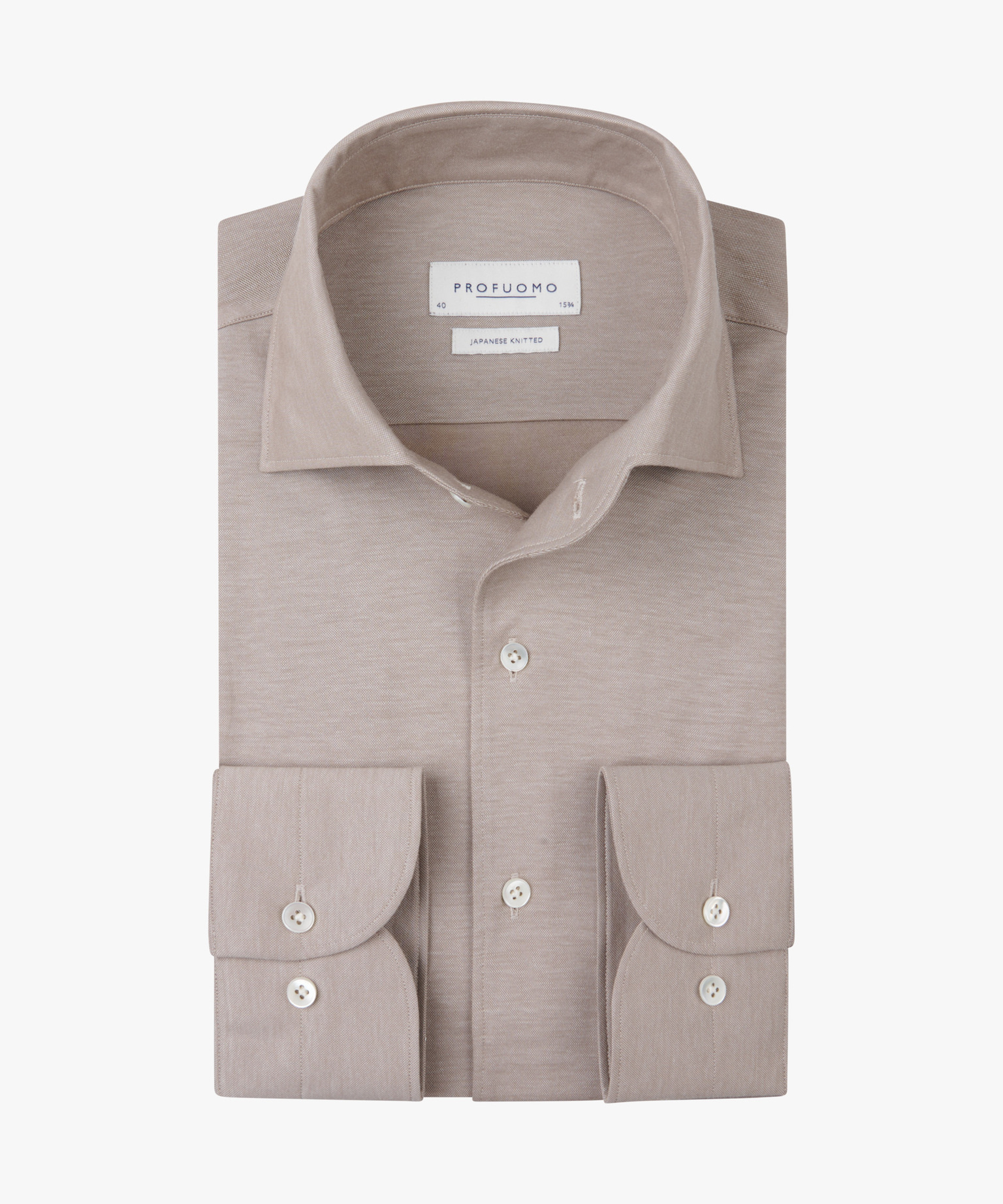 Een mooie overhemd met een once piece collar van Profuomo in Japanese Knitted. De uitstraling van een overhemd maar met het draagcomfort van een -T-shirt. Dat is Japanese knitted. De once piece collar zorgt ervoor dat de boord mooi wijd uit blijft staan.