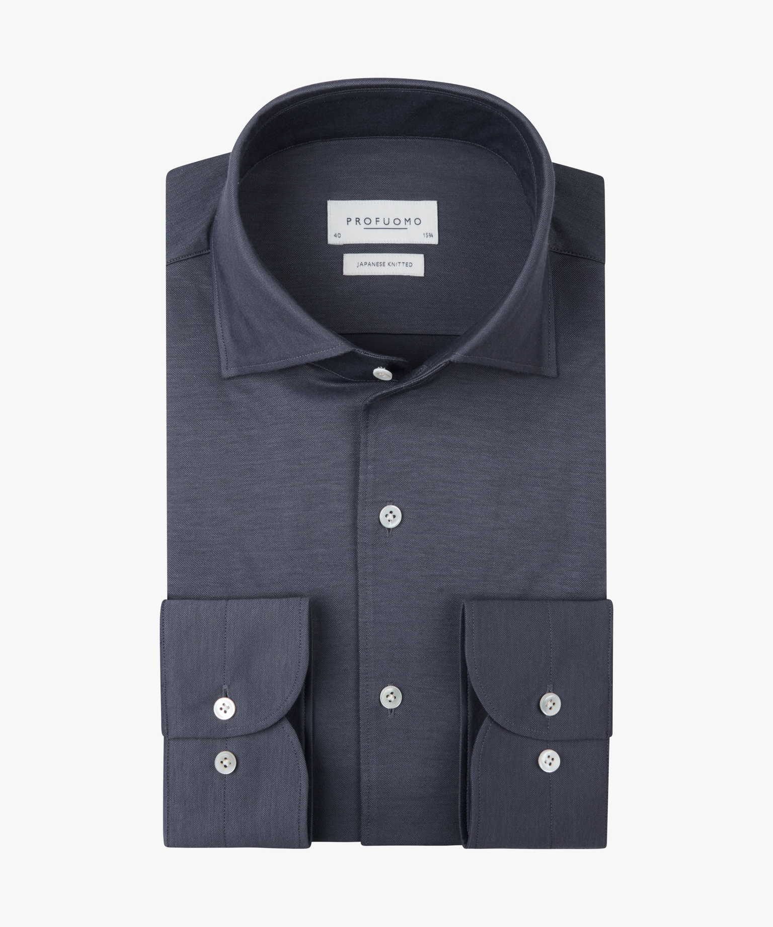 Een mooie overhemd met een once piece collar van Profuomo in Japanese Knitted. De uitstraling van een overhemd maar met het draagcomfort van een -T-shirt. Dat is Japanese knitted. De once piece collar zorgt ervoor dat de boord mooi wijd uit blijft staan.