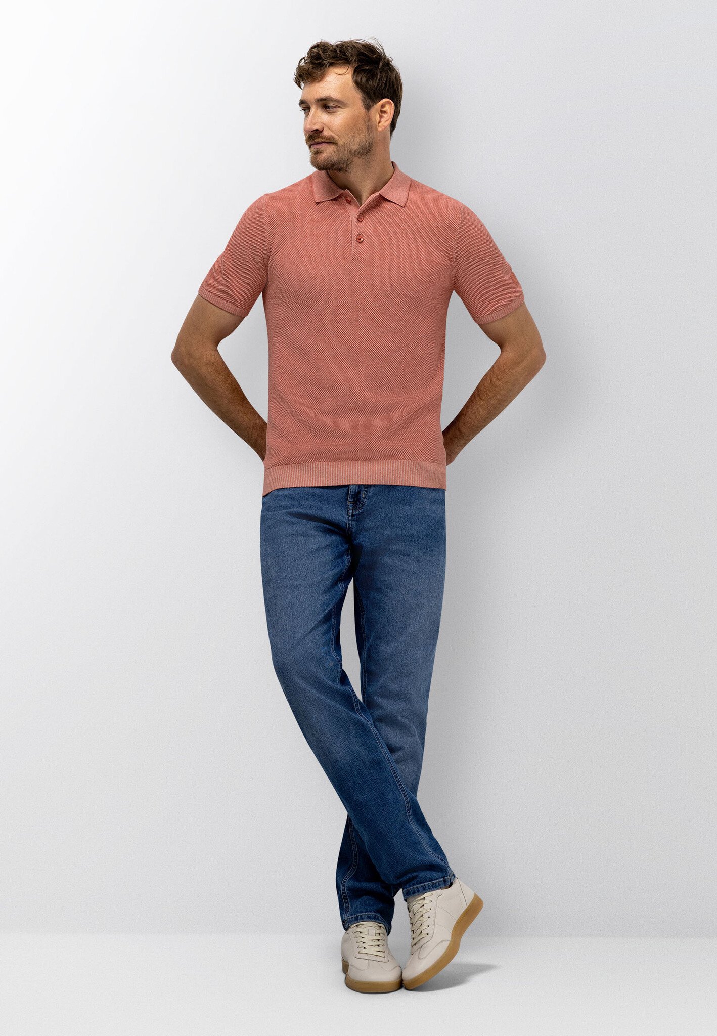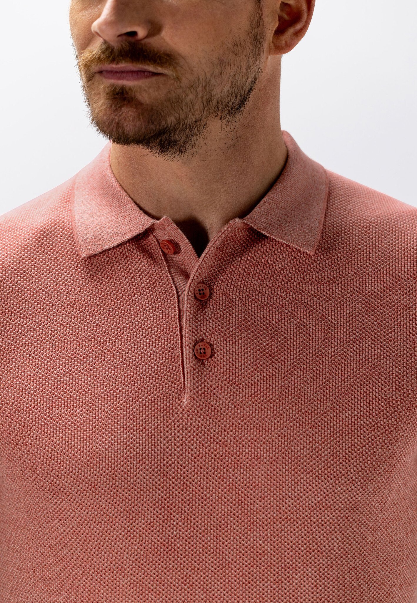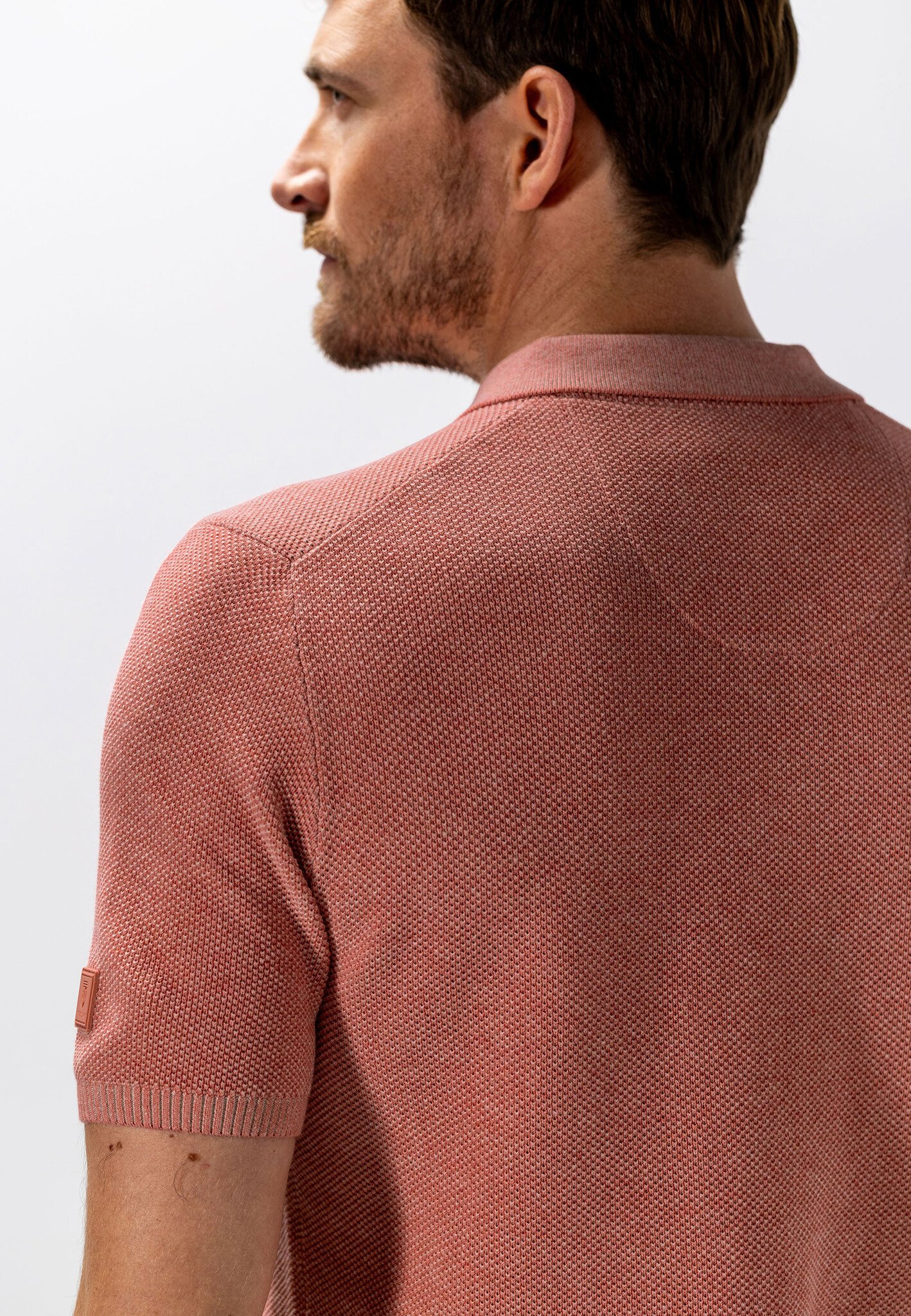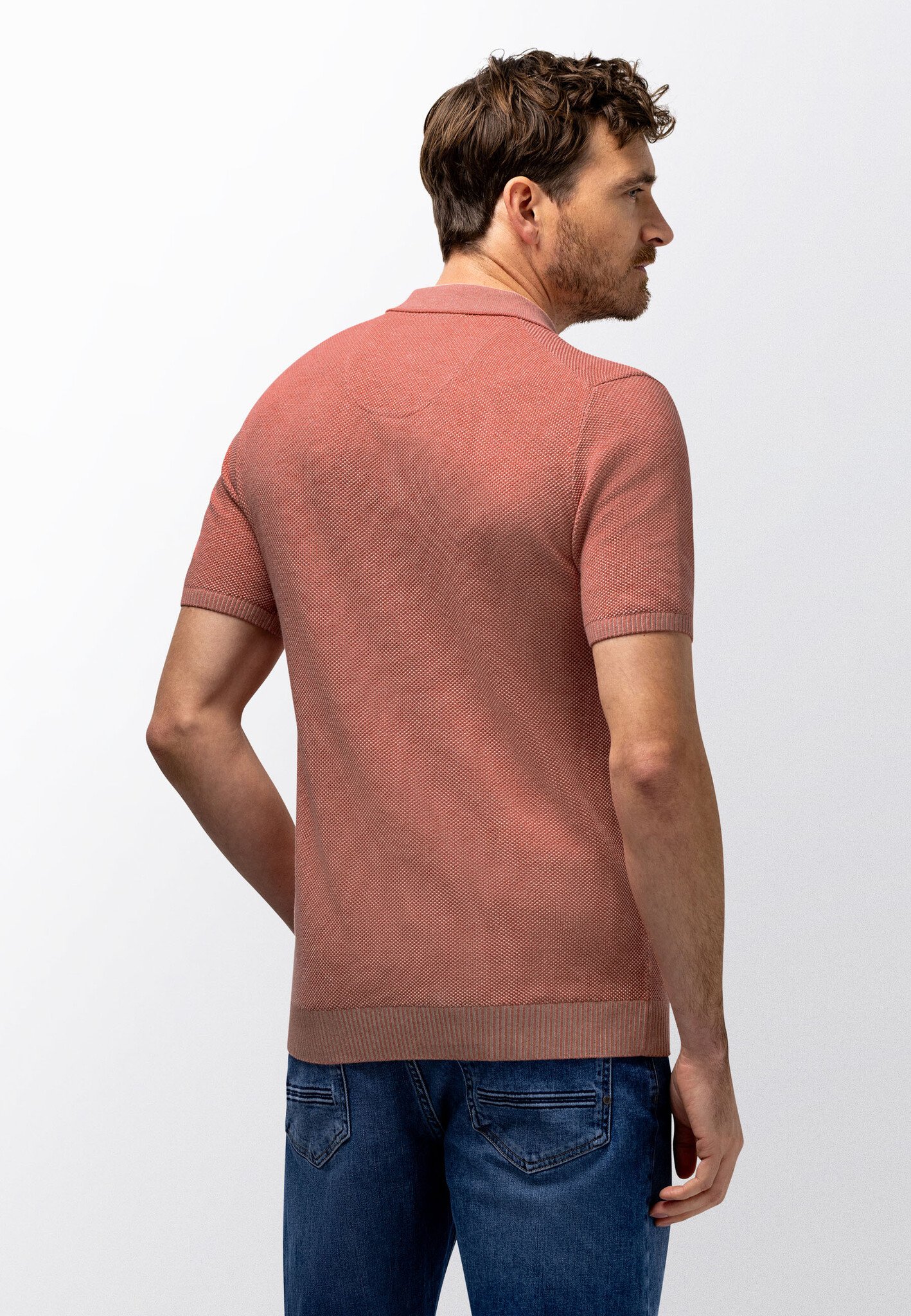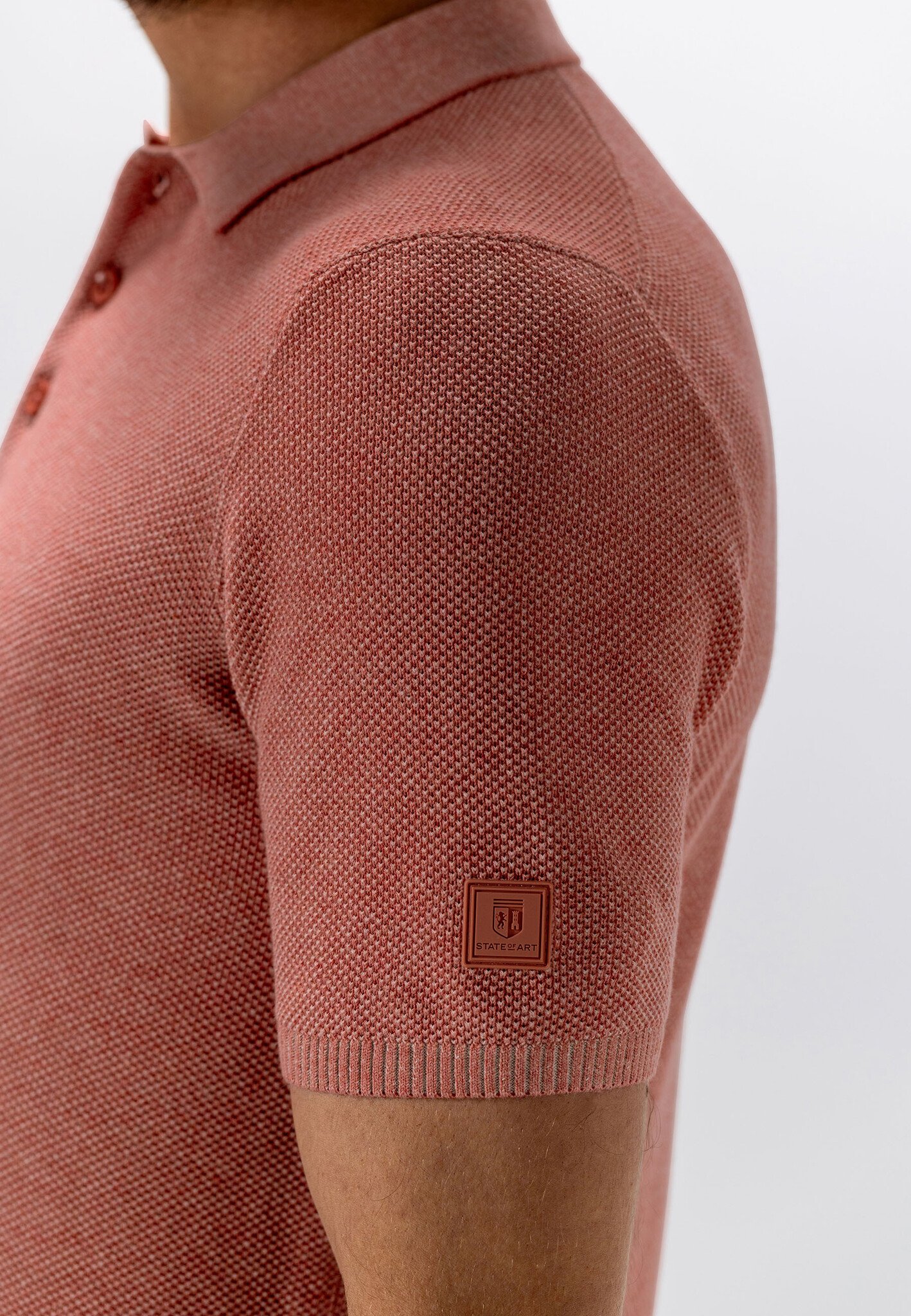Gebreide polo met korte mouwen in een regular fit, uitgevoerd in een gemêleerd design met een verfijnde honingraatstructuur. Deze structuur geeft de stof een subtiel reliëf en bevordert de ventilatie, wat zorgt voor een luchtig en comfortabel draaggevoel. Het ademende katoen voelt zacht aan en behoudt mooi zijn vorm, terwijl een rubberen badge op de mouw het geheel een moderne, verzorgde uitstraling geeft.