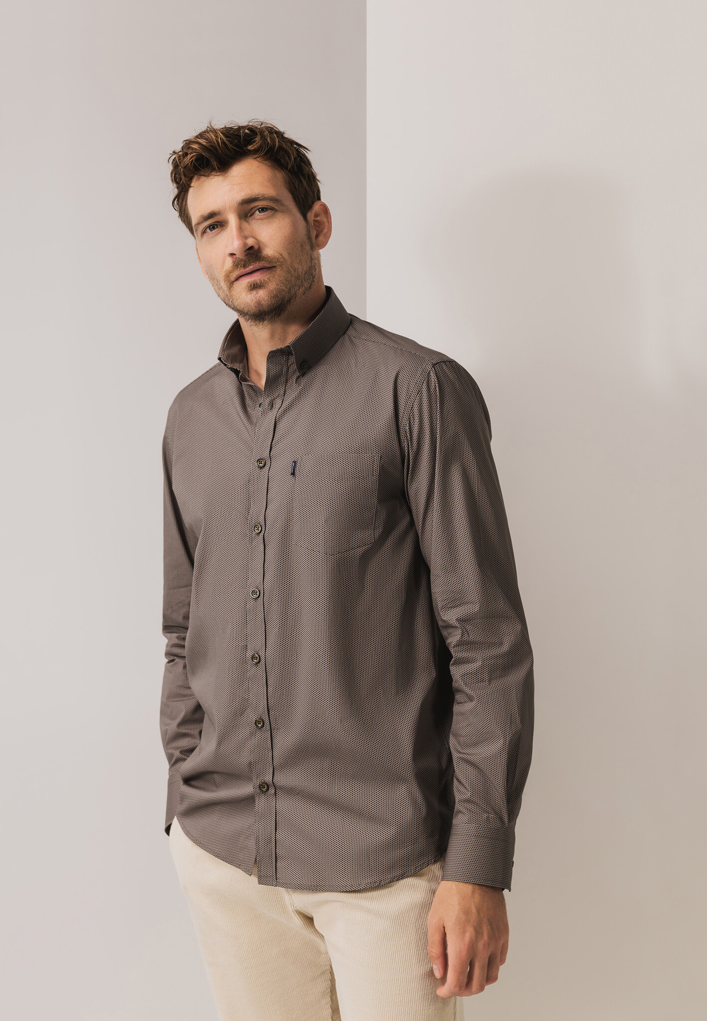 Dit overhemd met regular fit en button-down kraag is uitgevoerd in poplinstof van katoen met comfortabele stretch. De subtiele all-over print geeft het ontwerp een verfijnde uitstraling, terwijl de borstzak voor een klassiek accent zorgt. Dankzij de soepele stof en de prettige pasvorm is dit overhemd ideaal voor zowel casual als formele combinaties.