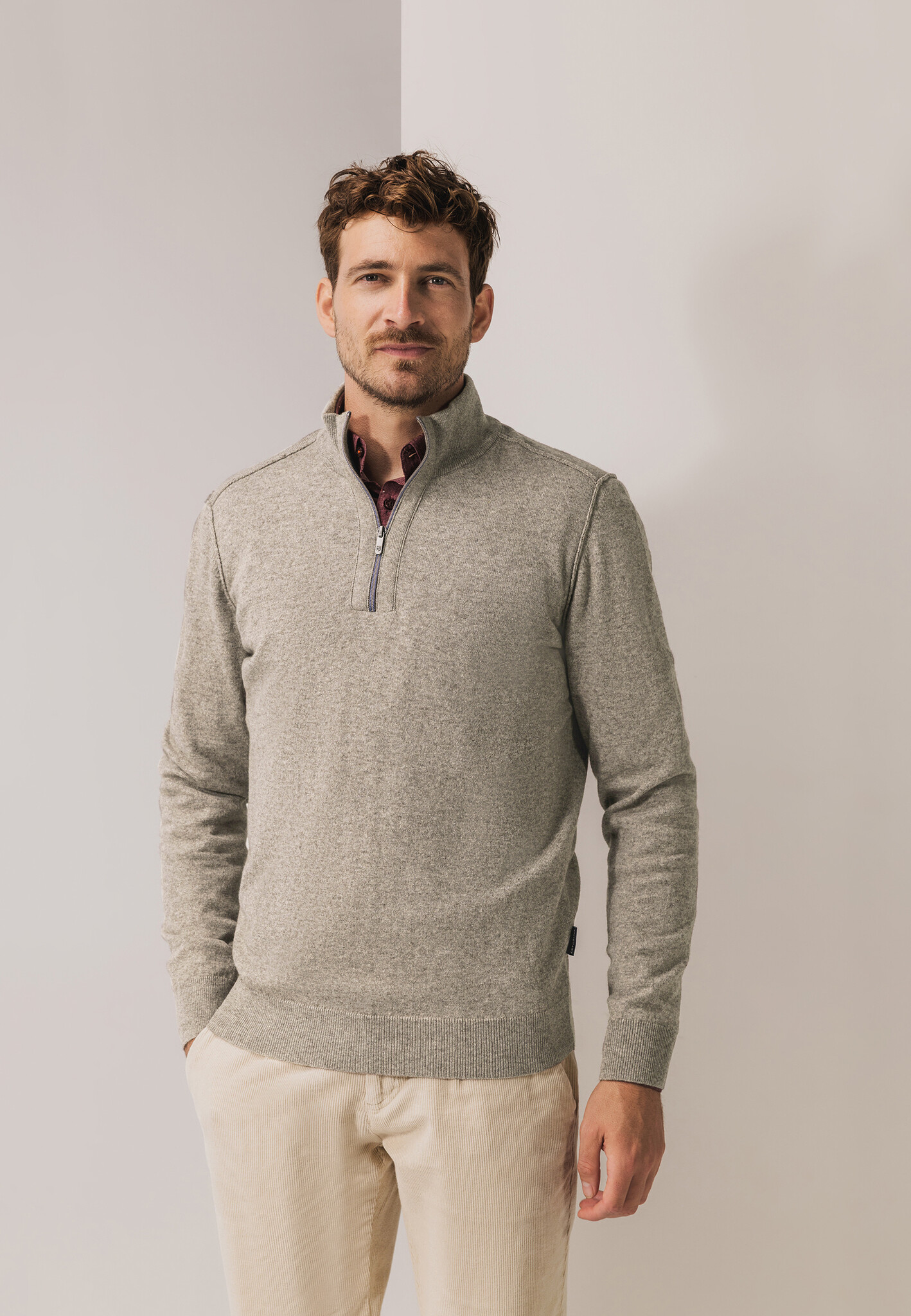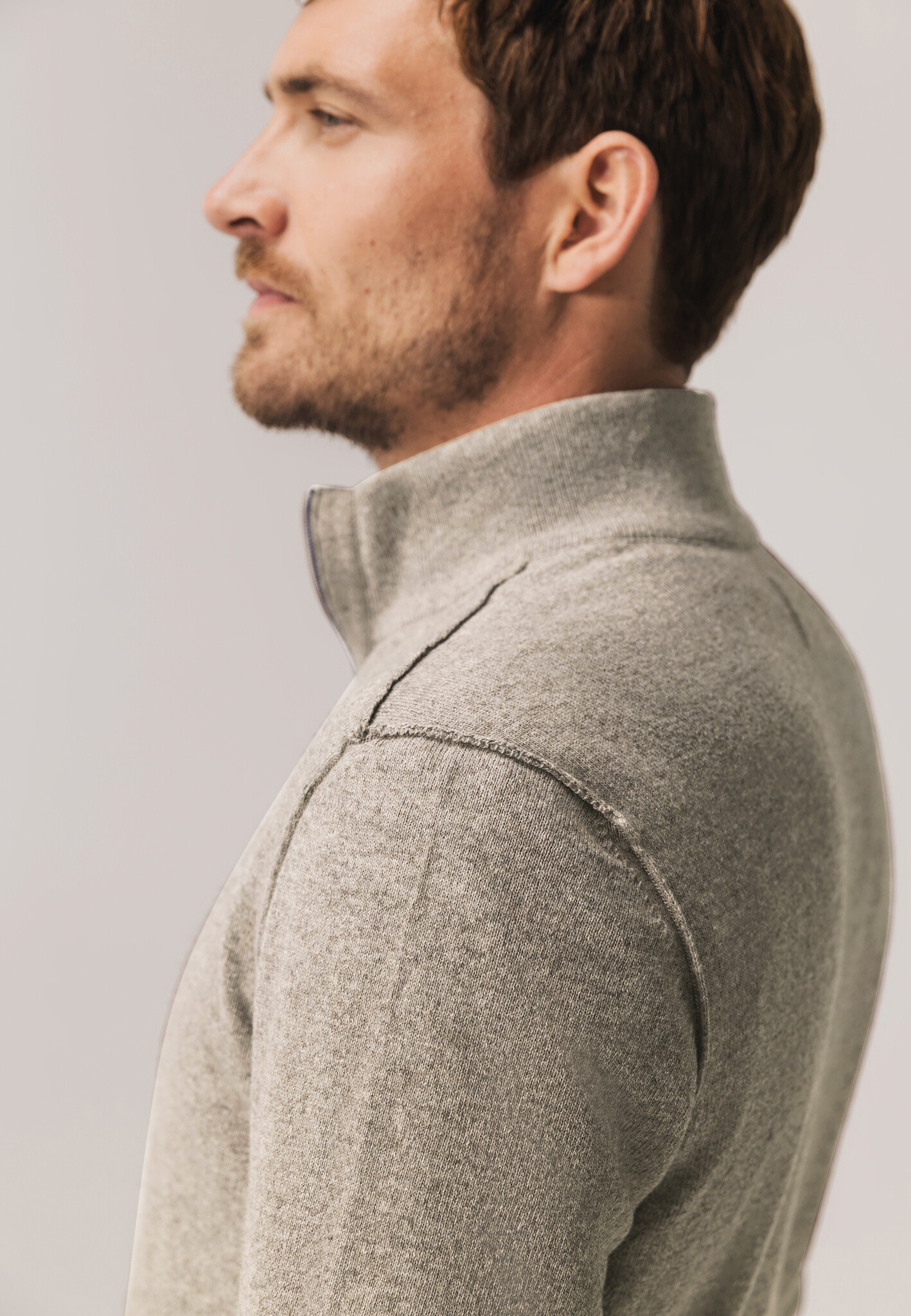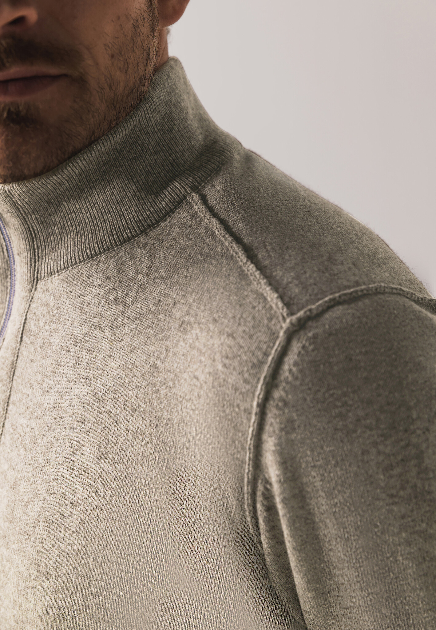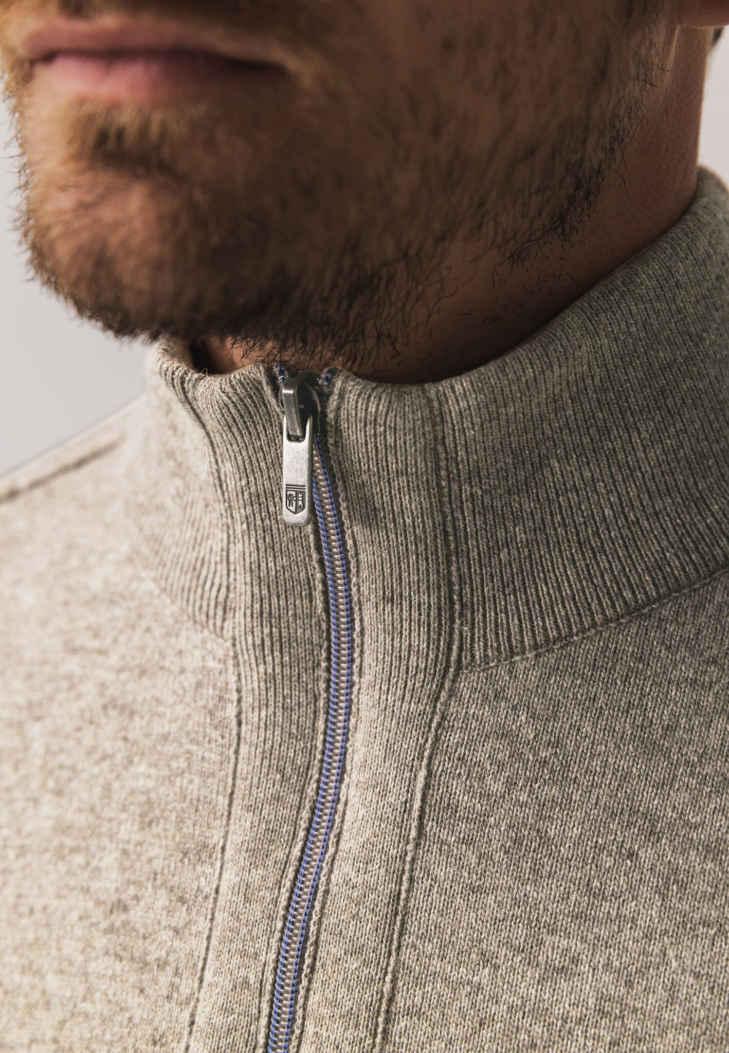 Deze trui is gemaakt van een blend van katoen en wol en voorzien van een regular fit en een halve rits met ribdetail. De binnenstebuiten afgewerkte naden geven een eigentijdse twist, terwijl de rubberen badge op de mouw een subtiele merkidentiteit toevoegt. De effen kleur en het cleane ontwerp maken deze trui tot een veelzijdig kledingstuk voor een comfortabele en moderne look.