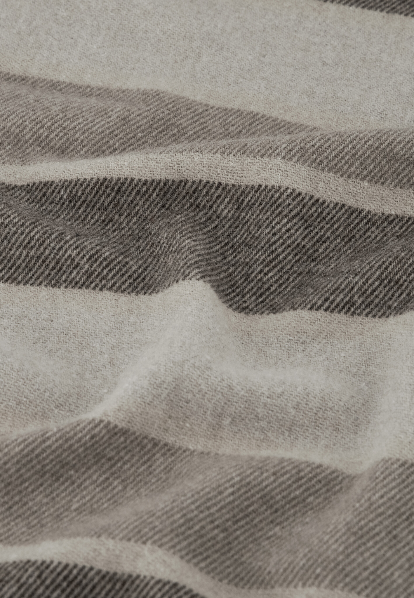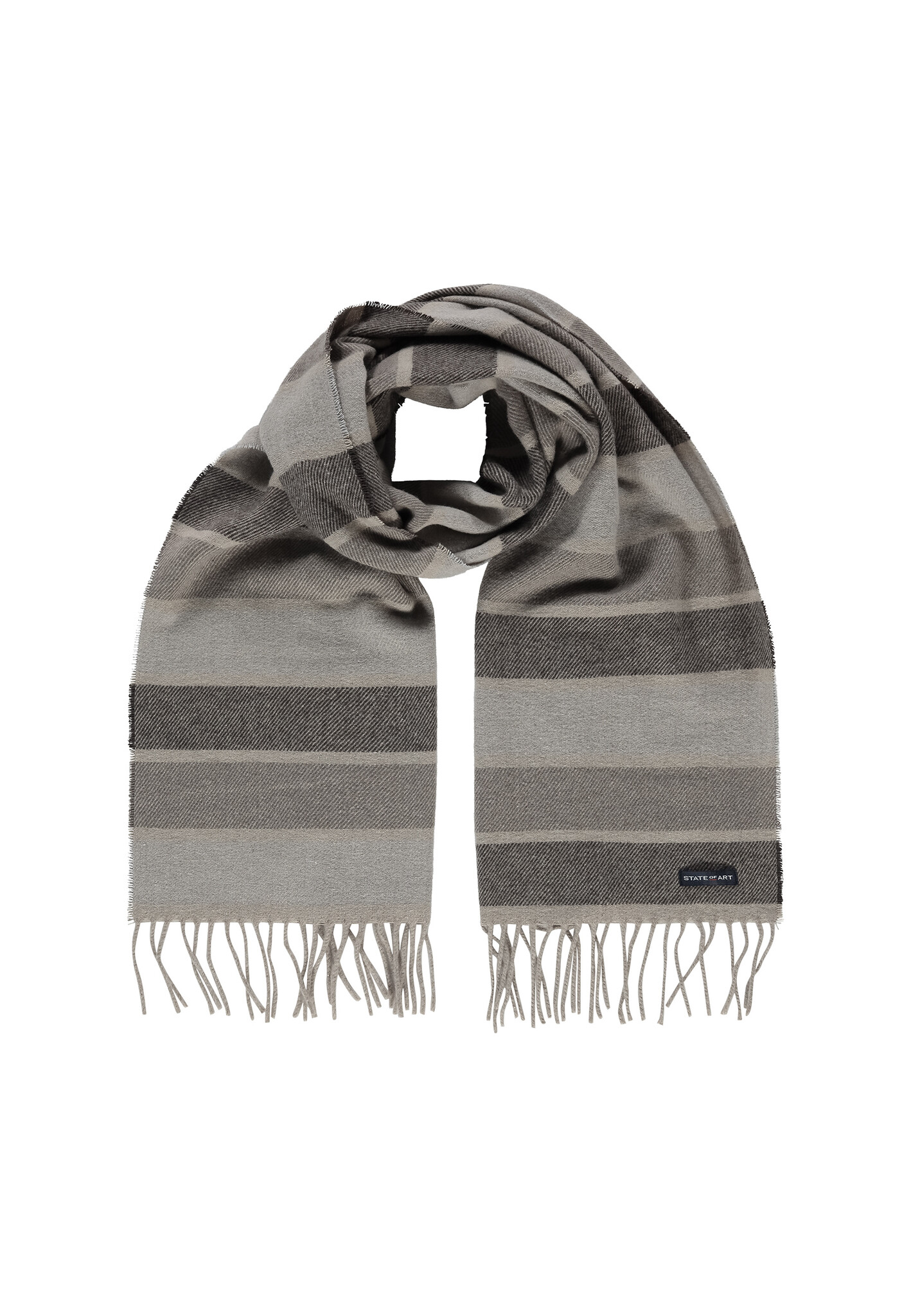 Deze gestreepte sjaal met lange franjes is voorzien van een merklabel. De mix van katoen, wol, viscose, polyester, polyamide en alpaca combineert warmte en comfort: wol en alpaca zorgen voor isolatie, terwijl katoen en viscose zacht aanvoelen en de synthetische vezels bijdragen aan de stevigheid. De lengte van de sjaal is 180 cm en hij is 30 à 32 cm breed.