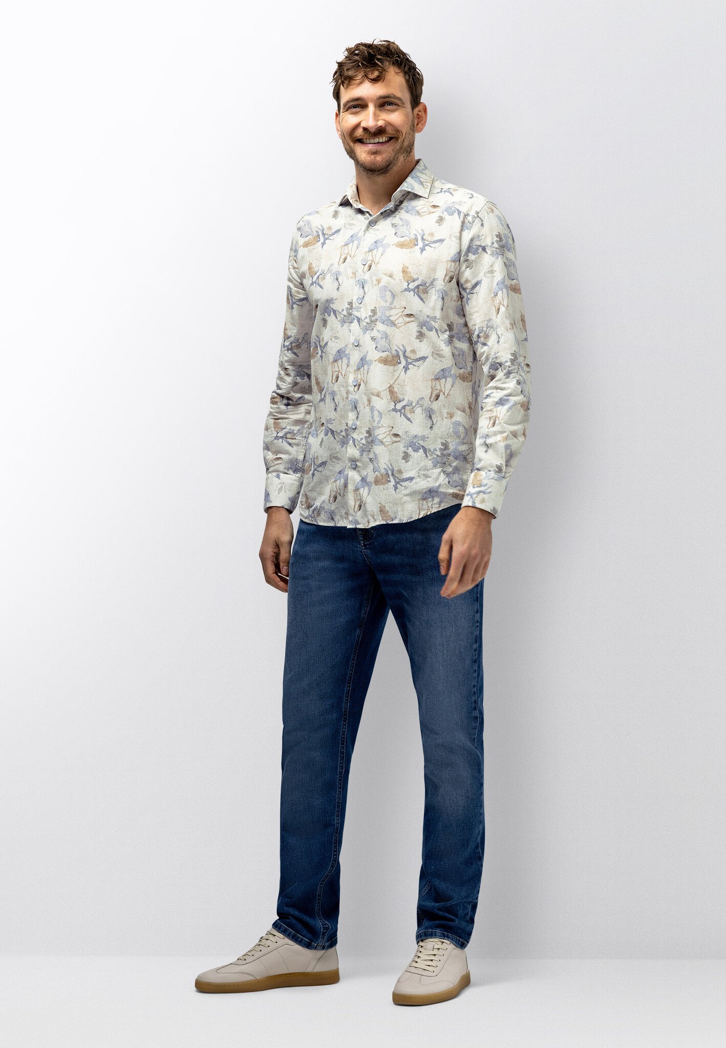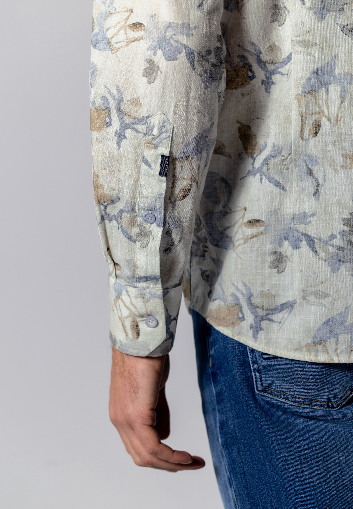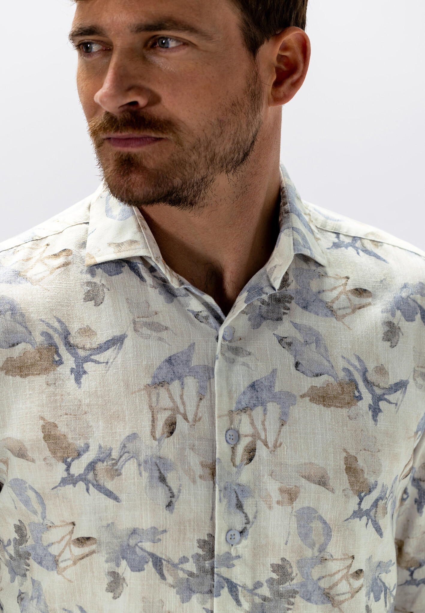 Overhemd met een all-over botanische print in aquarelstijl voor een zachte en verfijnde uitstraling. Het structuurpatroon geeft extra diepte aan de stof. De mix van katoen, biologisch katoen en elastaan voelt comfortabel aan en beweegt soepel mee. Uitgevoerd in een regular fit en afgewerkt zonder button-downkraag of borstzak voor een rustige, moderne uitstraling. Gecertificeerd volgens de OCS Blended-standaard.