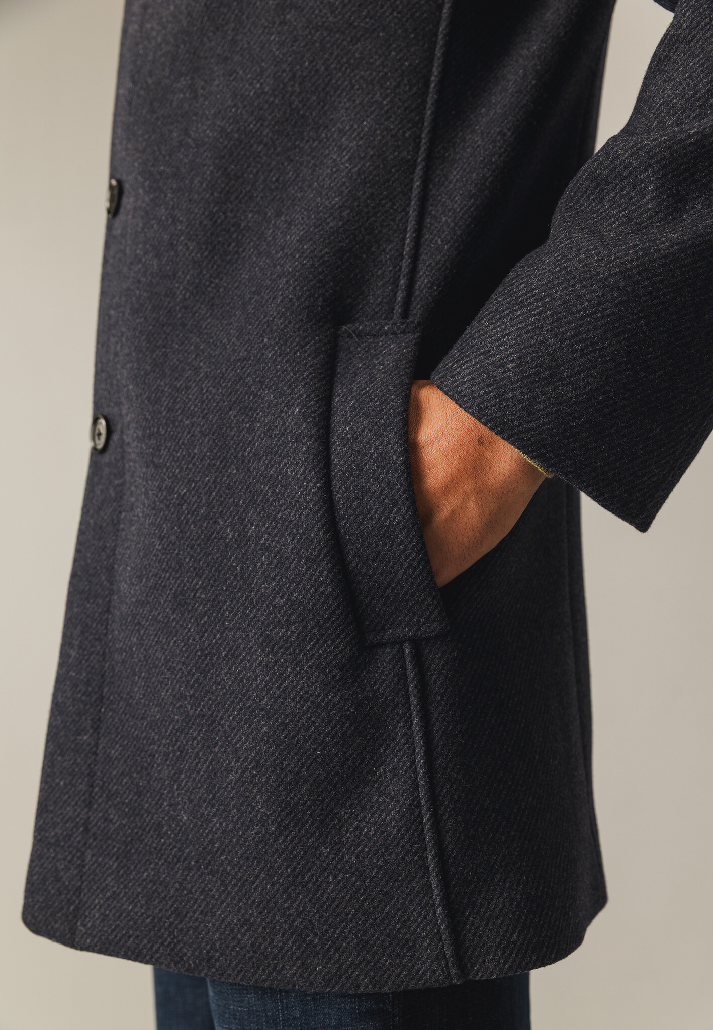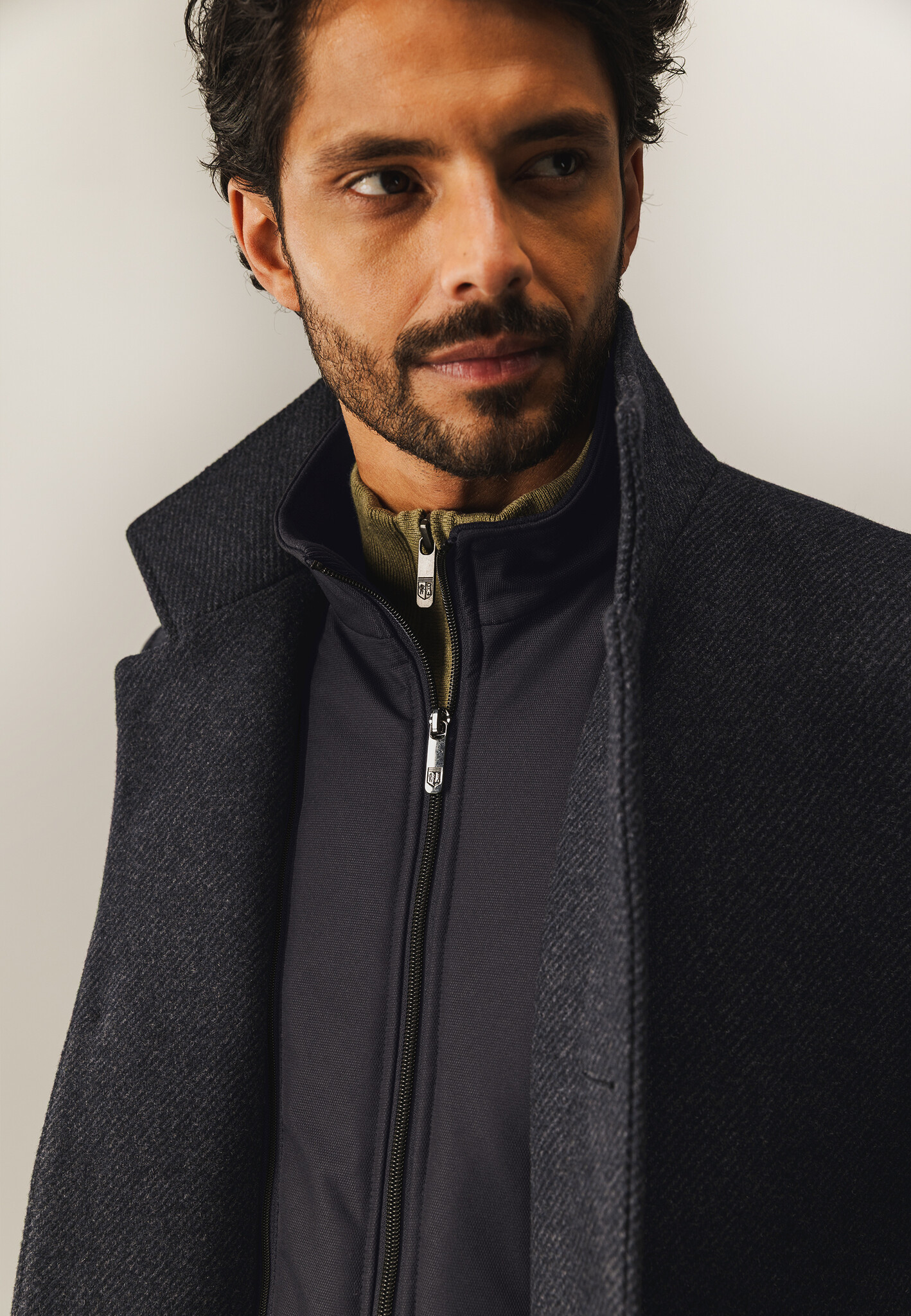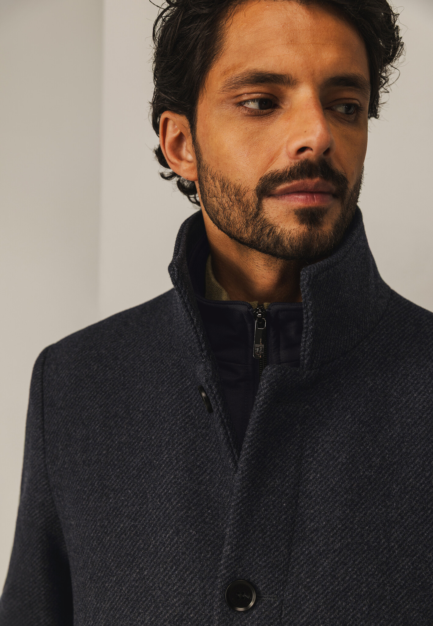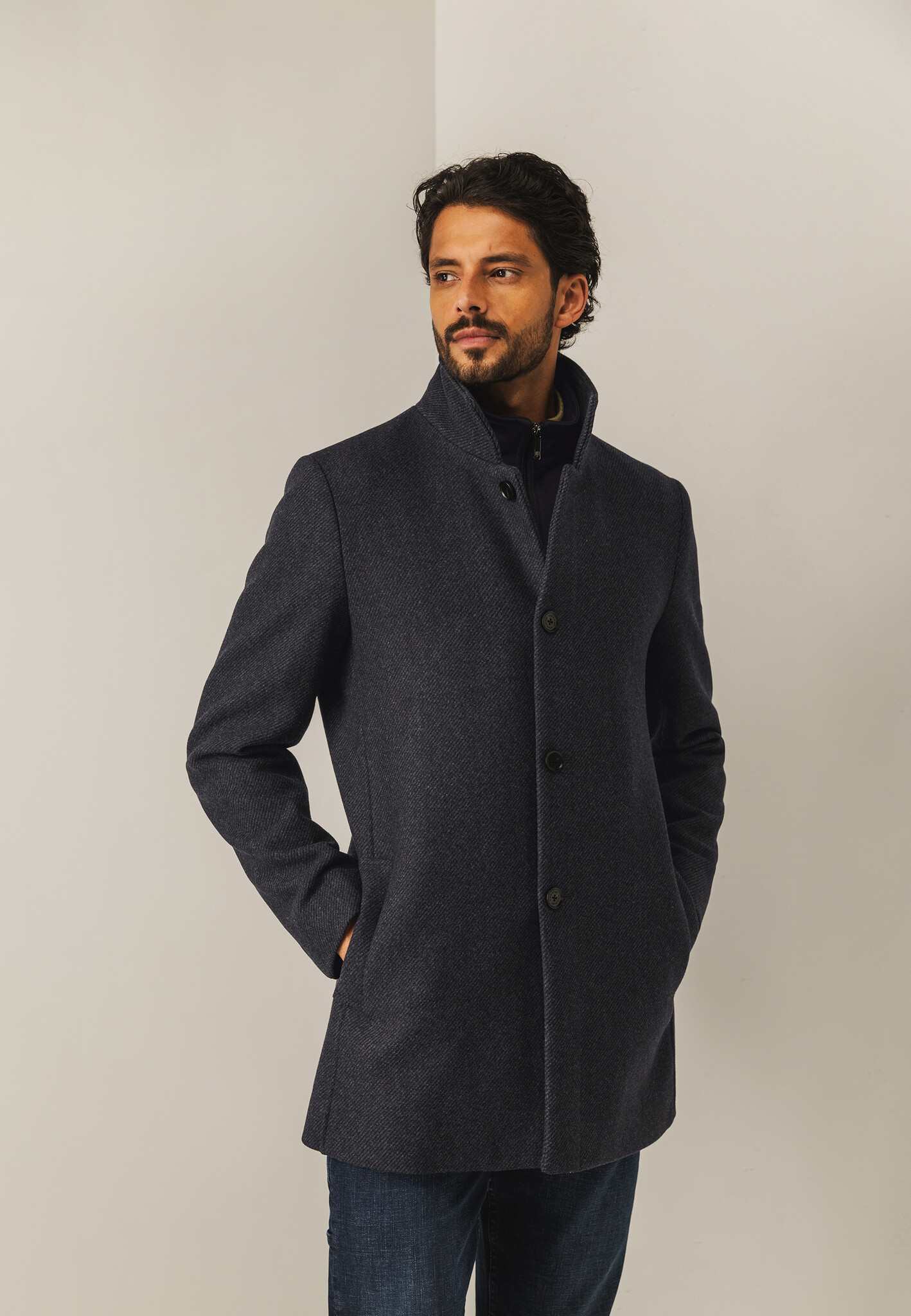 Deze regular fit lange jas heeft een hoge kraag en een praktische nylon inzet, voor bescherming tegen wind en kou. Vervaardigd uit een polyester-wolmix biedt hij warmte. Voorzien van zowel een knoop- als ritssluiting en met twee steekzakken en twee binnenzakken, waarvan één met knoop.